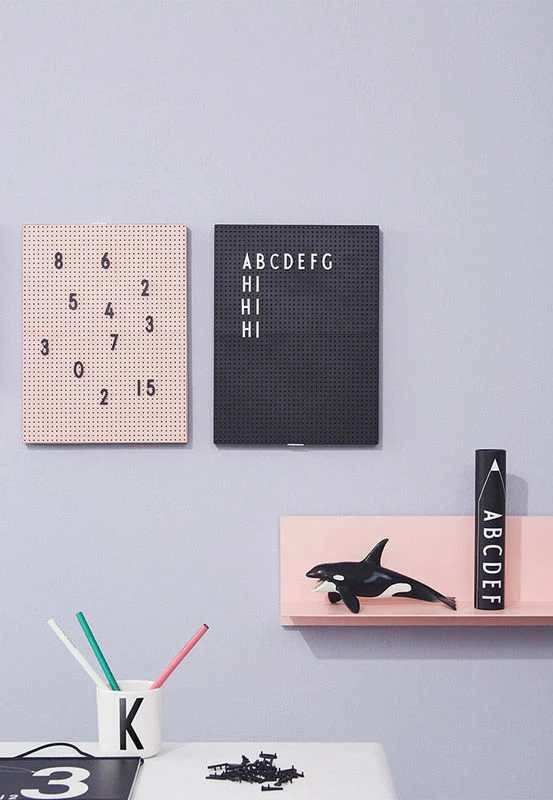 The Design Letters brand offers us a complete range of objects decorated with stylish lettering. The cult-style font used was hand designed by the legendary Arne Jacobsen in 1937. Using decorative lettering of all sizes indoors is a big trend at the moment! Bring your walls to life with custom messages… A vintage design for this memo board which is reminiscent of the perforated boards used in workshops to hang tools! It has a grid in ABS on which you can freely hang letters and figures so as to write messages (letters and figures not provided: Sold separately). The letters and figures have pins which easily slide into the grid. Fixed to the wall like a panting, you can create your own art deco! Write what you want: Your daily mood, a loving message, something quirky or funny, a quote, or a mantra. You can even write your shipping list or meetings. This memo board fits just as well in a child’s bedroom: Kids can practice writing and have fun with letters. Please note, the letters and figures are not provided with the board. You can purchase a set of letters & figures separately, in two sizes.