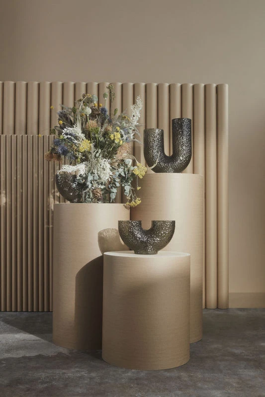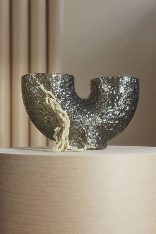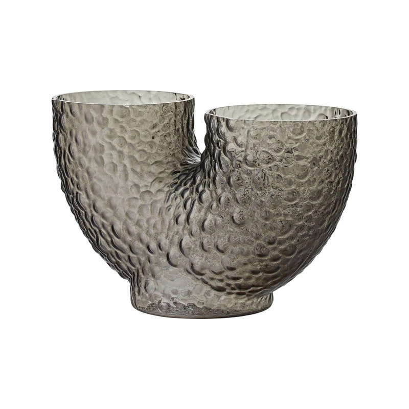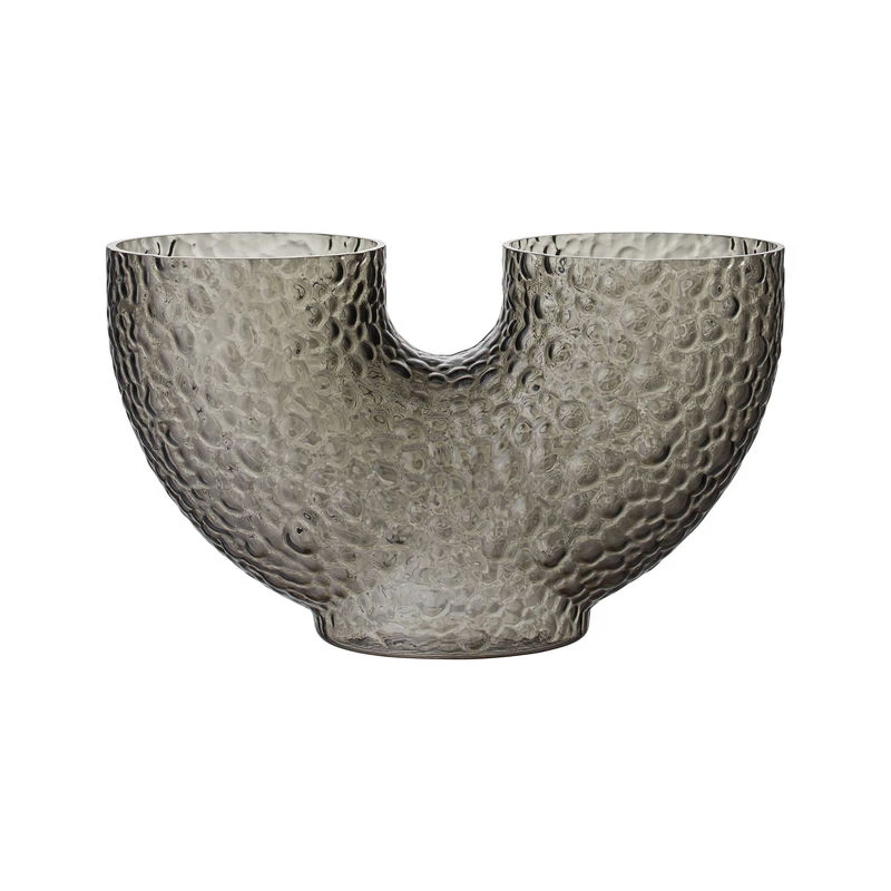 Arura vases are made of hand-blown glass, which makes each piece unique. Eccentric and mysterious, they feature strange, curved shapes that irresistibly catch the eye and stimulate the imagination. The double opening suggests a new way of arranging flowers. The textured glass is decorated with embossed patterns. This incredibly tactile surface is reminiscent of reptile scales or the rough, bumpy surface of animal skin. Both refined and wild, these vases embody an organic sensibility and arouse poetic sensations. It’s the grain of the material, its roughness, its irregularities that give it its character. Arura vases dress your room with their graphic presence.