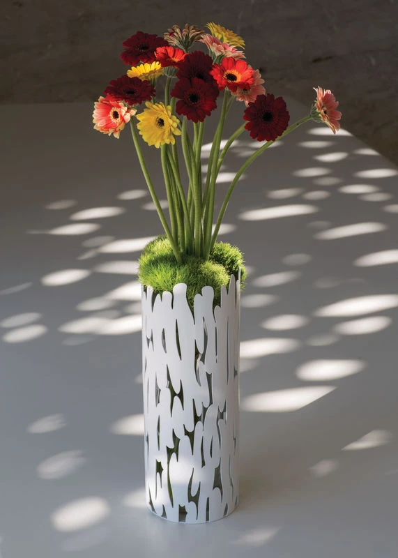 Alessi’s Bark collection is inspired by nature. The finely cut steel recalls the bark of the trees and gives this collection a great lightness. The harmony of the solid and the void rests the gaze and confers on Bark a lot of elegance. The floral compositions deposited in the Bark vase are then a natural extension to the wooden bark, its visual impact is strong and harmonious.