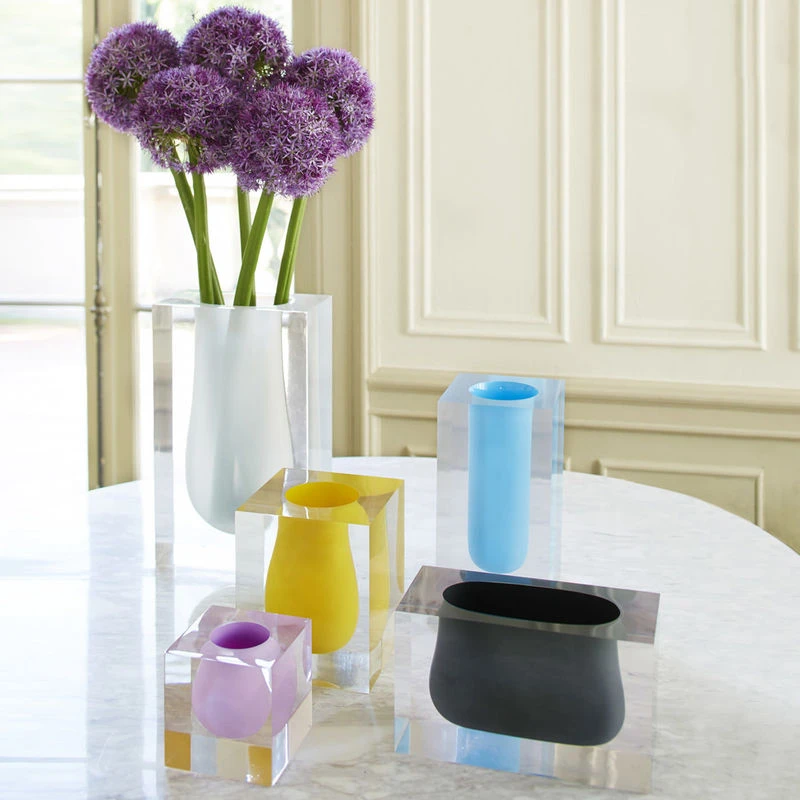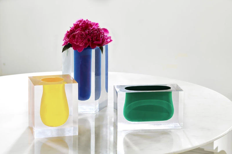 Suspended beauty… This surprising vase is writing a new chapter in terms of exacting research into forms and materials. It is made up of a colourful acrylic container with a curved and organic form enclosed in a block made from transparent acrylic. The colourful form seems to float inside of the transparent tube. The shapes overlay to form a dual-walled object, creating a subtle interplay of colours and transparency.