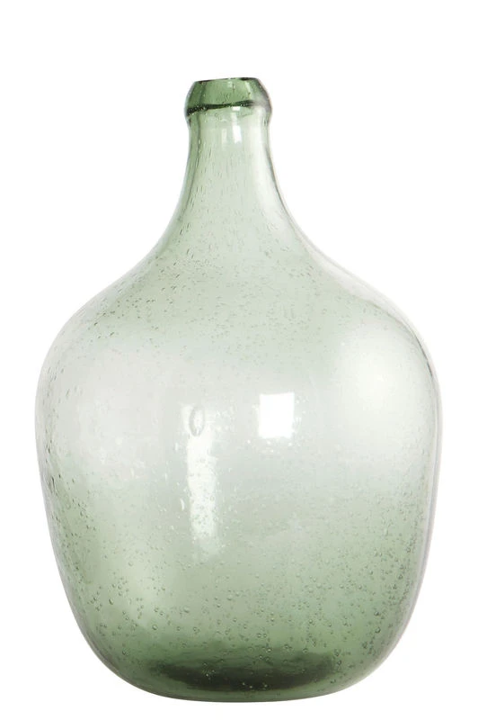 This elegant mouthblown glass vase offers a contemporary interpretation of the old bottle. This manufacturing process gives small bubbles and irregularities in the material, which makes each piece unique. Because it is solid colored, the light green glass that constitutes this vase will keep its nice shade over the years. It is perfect to hold some flowers but will be also noteworthy as a decorative element.