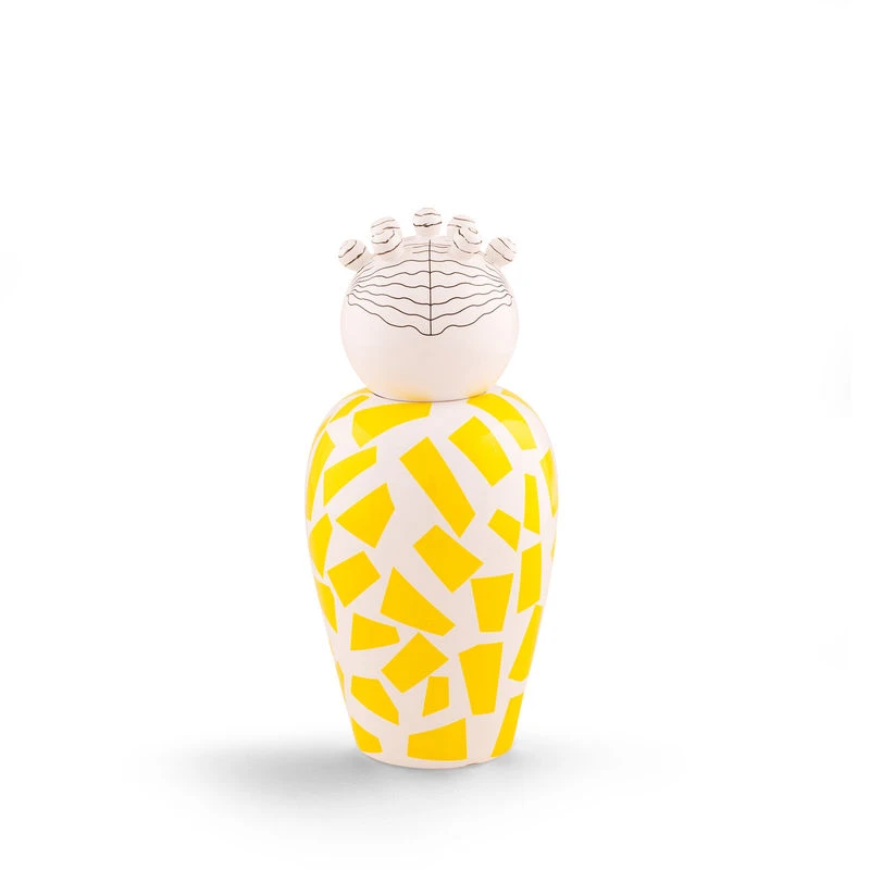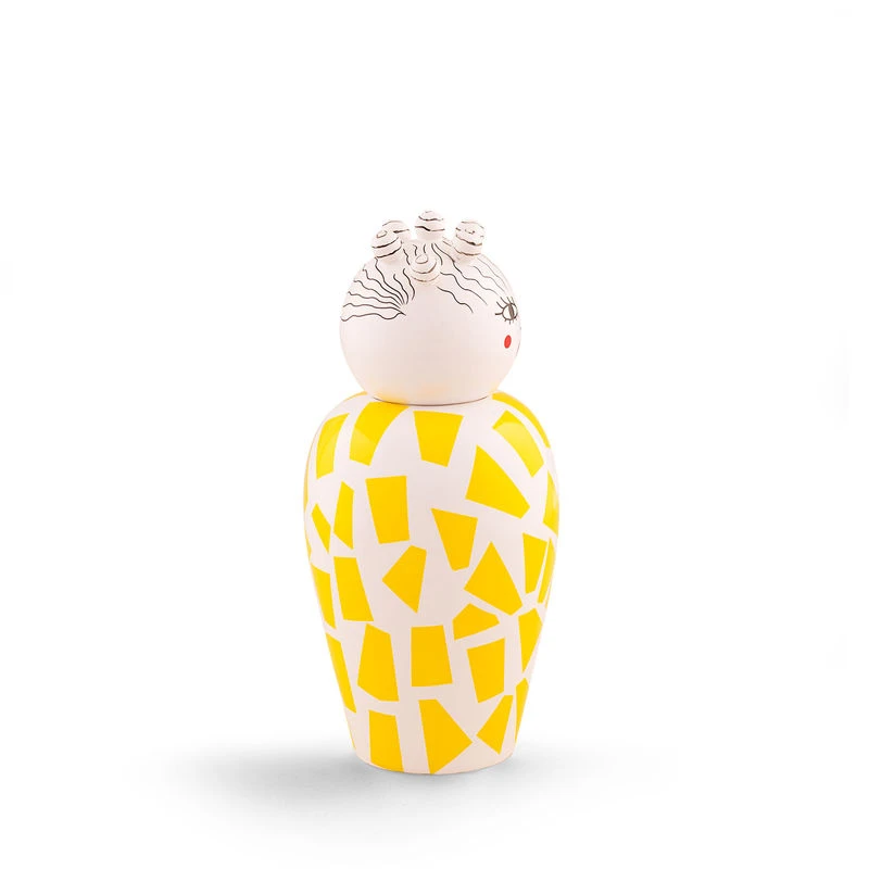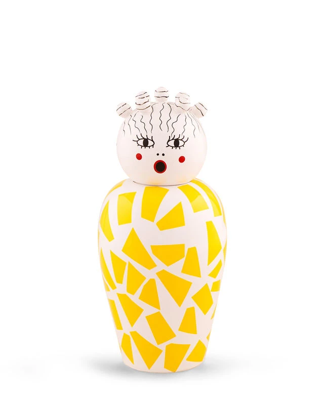 Colourful and cheerful, these vases are as functional as they are decorative. Canopie is a collection of porcelain vases made by designer Elena Cutolo. Each vase represents a young girl from a different origin: Pepa from America, Lula from Oceania, Rosio from Africa, Izumi from Asia and Zoe from Europe. To tell them apart, these vases sport different colours and patterns, faces with distinct expressions, as well as a different hairstyle. Each has its own personality! When she designed the Canopie vases, Elena Cutolo imagined an encounter between five friends who wanted to share a friendly moment together in diverse cultural contexts. In this world that has become completely virtual, where touch screens are king, these young girls therefore prefer to share their different values, habits and customs. They also each take gifts from their continent for the others to discover … When you’re not using them, your vase with its lid is a beautiful decorative item. With its generous size, this vase can also act as storage and accommodates various objects in its belly.