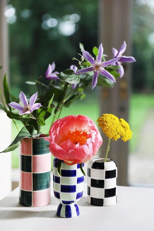 An ultra-graphic effect is guaranteed with these joyful and colourful vases. Geometric patterns are combined with a wonderful colour palette of vibrant, acidulous tones. This set consists of three ceramic vases boasting a stunning harmony of shapes and colours. They can be assembled to create an elegant yet eccentric composition.