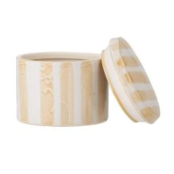 A country feel for this little ceramic box. It’s decorated with colourful hand-painted stripes. This intentionally naive, imperfect motif gives the product a delicious artisanal dimension. Suitable for food use, you can keep sugar or sweets in it. It can also hold jewellery in a bedroom, small office accessories… Each hand-decorated piece is unique.