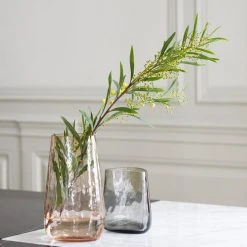 Made from mouth-blown glass, this trio of vases plays with the transparency of the material to create a wavy and liquid effect. The organic lines, intentionally irregular, communicate a craft feel. These vases are available in three sizes, each with its own hue.