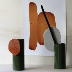Since the early 2000s, the work of the brothers Ronan and Erwan Bouroullec has emerged as one of the most representative of the dynamism of French design. Working as a pair since 1998, the two brothers now design for many industrialists, while pursuing experimental research. Known for their formal research, particularly on vases, the brothers Ronan and Erwan Bouroullec designed the Découpage collection: amazing vases, with strong plastic and sculptural qualities. The Découpage vases are composed of a cylindrical body in enamelled porcelain on which various decorative elements are grafted in clay in fluid and organic forms. These plastic assemblies form abstract compositions that play with various combinations of shapes and colours. The decorative clay elements (plates, bars, etc.) can be removed: like a painter composing a painting, the user is invited to put together their vase. Ronan and Erwan Bouroullec: ”Each shape is cut out of a plate of clay. Some of them fit. Others stick together. Some of them stick out. Others join together. Each cylinder is cast. All of them are figures of a unique and capricious composition.” All the elements are hand-dyed. With their irregular contours, they have a distinctly handcrafted appearance. Together they make up poetic compositions that look different from every angle. whimsical, ironic, unusual, lively. Ronan Bouroullec explains: ”The arrangements are in a delicate balance, as contrasting colors and layers converge to create a new harmony.”