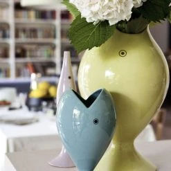 With their mouths open as if eagerly awaiting for water and flowers, the three fish-shaped vases in ceramics are a manifestly iconic and ironic project. The Pesci taliani Collection is inspired by three typical Mediterranean fish, each with a ifferent size and shape : an anchovy (pink), a gilthead (turquoise) and an opah (yellow).