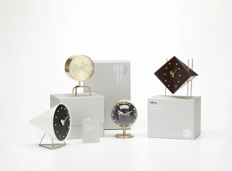 George Nelson (1908 – 1986) is considered to be one of the founders of American modernism. He contributed to the beginning of modern design with a human dimension. Renowned for his collaborations with brands such as Vitra and Herman Miller, he has created several products that are now considered to be icons of mid-20th century modernism. In 1947, the American designer George Nelson was commissioned to create a collection of clocks. Nelson analyzed the way people used clocks and concluded that they read time by discerning the relative position of the hands, so the numbers were unnecessary. Also, as most people wore wristwatches, he assumed that clocks had become more of a decorative element for homes. These ideas formed the base of the first collection of 14 clocks, consisting of a completely new style of wall clocks and compact table clocks, which was launched on the market in 1949. Although the models all have a common feature – no numbers – their shapes, colors, materials and design could hardly have been more diverse. Over the next 35 years, Nelson Associates designers created over 100 different clock models: wall clocks, portable table clocks and built-in clocks. After Nelson’s death in 1986, the Vitra Design Museum acquired his inheritance, which includes approximately 7,400 manuscripts, plans, drawings, photographs and slides dating from 1924 to 1984. Vitra launched the reproduction of the Nelson Clocks in 1999 and updates the collection from time to time. Desk Clocks are available in various shapes and materials. Equipped with a high-precision quartz mechanism, they continue to offer a new alternative to classic clocks.