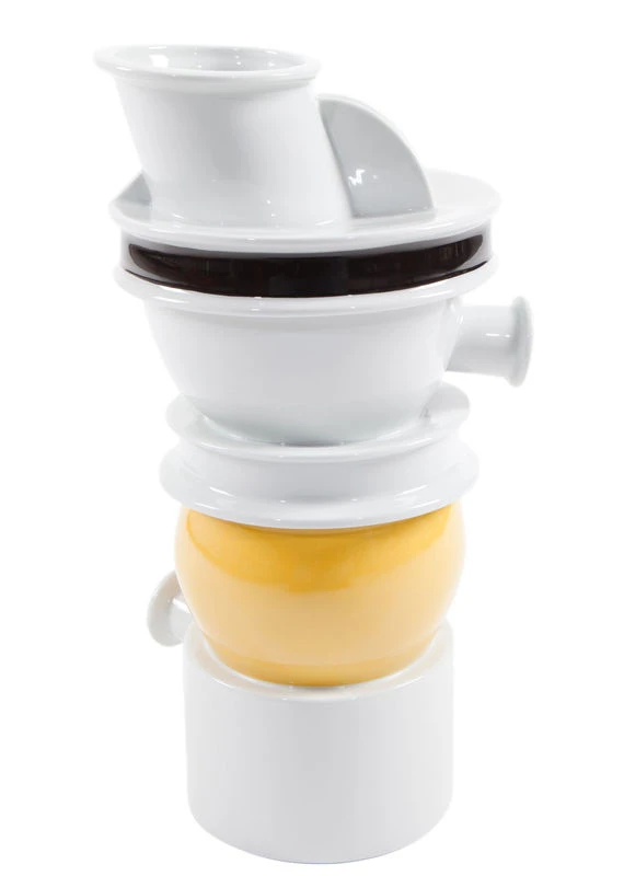 Memphis is the great cultural phenomenon of the ’80s that has revolutionised the creative and commercial logic of the design world. Created on the initiative of Ettore Sottsass and a group of young Milanese architects and designers, shortly to be joined by some of the most famous names on the internatinal design scene, Memphis overturned all the existing preconceptions around the idea of “iving”. With Ettore Sottsass as the backbone of the group, Memphis abolished the creative limits previously dictated by the industry, and Design assumed a new expressivity in the form of new shapes, materials and patterns. Thus, the Memphis movement has become an almost mythical symbol of “New Design” and its influence is still strong in many areas of production and beyond.The Euphrates vase was designed by Ettore Sottsass in 1983 for Memphis Milano 1981-1988. A classic by Sottsass, the Euphrates porcelain vase is part of three ‘rivers’ vases designed for Memphis: ilo, Tigris & Euphrates. Signed.
