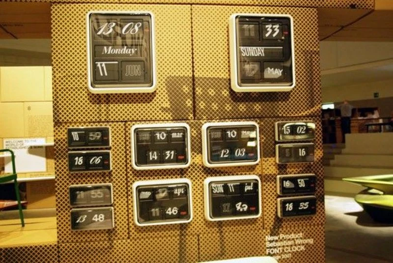 The Font Clock is a 21st century take on the british 24 hour clock design icon. Twelve different fronts are printed within the mechanism of the clock providing a random, mixed display of graphic language within a single timepiece. The essence of the idea is the twelve fonts, all chosen for their design strenght and individuality and all of which are twentieth century apart from one, an english 18th Century script… in theory, at given points within the annual time cycle, all the fonts will run together for 5 minutes.