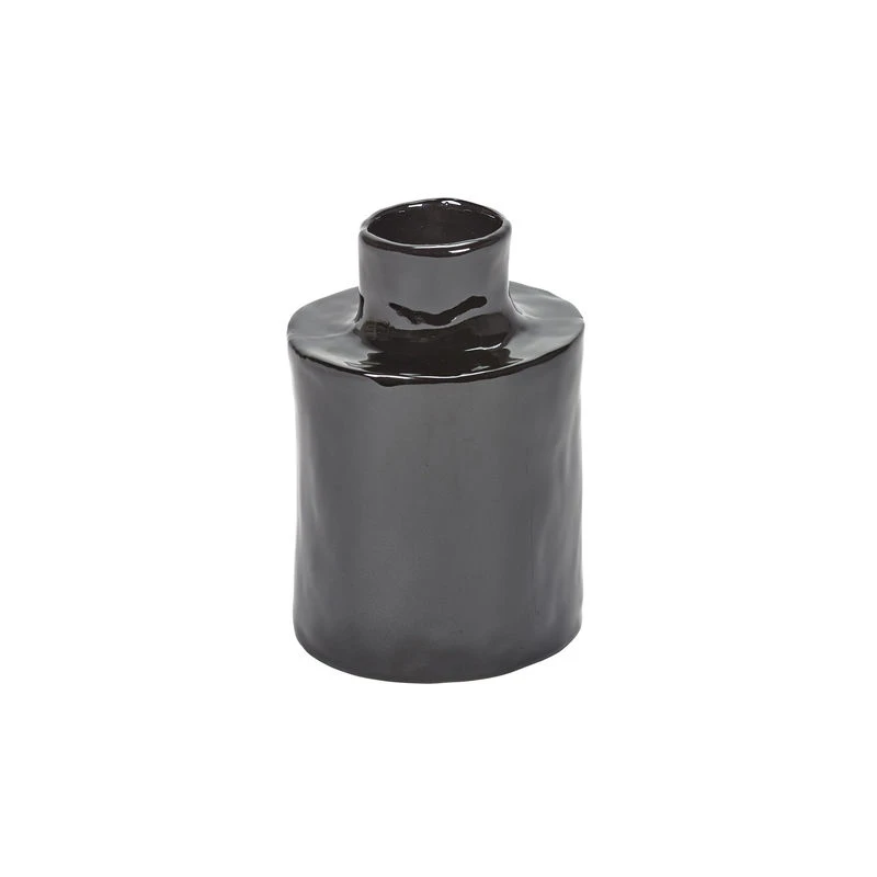 The five Héléna vases, in dark brown (almost black) sandstone, represent the first foray of Belgian artist Marie Michielssen into ceramics. Those who are familiar with Marie’s work know that she likes to let her hands lead the process. On this topic, she’s previously said that the repetitive nature of the actions use in modelling with plaster and papier-mâché meant that it was like meditating for her. The switch to ceramic thus wasn’t a big change. The Héléna vases have simple, cylindrical shapes, where the irregular shape of hand-modelling are clearly marked. Marie Michielssen has a preference for materials that she can mould by hand. She allows herself to be guided by her intuition, to give shape to items with an atypical and poetic look. The designer never starts by throwing down ideas on paper. No technical drawings or 3D models on the computer: she prefers to let the material express itself during the creative process by shaping it by hand. “During the modelling process, I often play with primary shapes like cylinders, spheres and squares. I bring them together to create new shapes. It’s all very intuitive.”