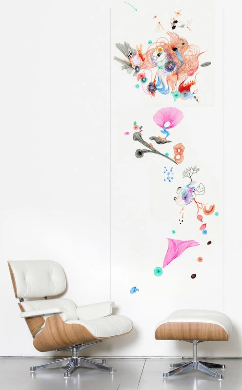 One strip is a collection of wallpaper strips drawn by graphic artists and designers. Conceived to be used and installed vertically or horizontally, they are all deployed in the width of a single strip of 50cm. Midway between illustration and trompe l'oeil, some models look for a space in this very vertical format to deploy ornamental or narrative proposals (Tado, Coco Tassel, Ryan Cox, Pandarosa, Mark Verhaagen), while others take the reverse track of opening new paths, looking for new uses to renew wallpaper. Thus Ich&Kar propose a learning or overhaul of the multplication and Bescherelle tables, matali crasset and Frederick Grasser Hermé propose installing a sauce tree in the kitchen to accommodate your everyday dishes with simple recipes, and Ana Mir and Emili Padros tear us away from work to recall us to our physical needs of stretching and exercising … Other proposals bring out the qualities and subtleties of the drawings of graphic artists and artists like Florence Manlik, Anamorphée and Leslie David.