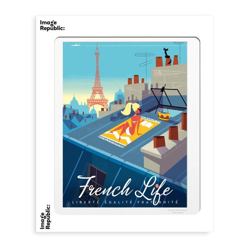 Step inside the ”Image Republic” art gallery: a comprehensive selection of trendy, exclusive posters that will appeal to fans of graphic design and visual arts! Made in France, these prints of exceptional quality immortalise drawings by inspiring artists. Collaborating with influential artists, press cartoonists and world-renowned illustrators allows Image Republic to offer strong, communicative images. Some deliver a message, others mark an era, a moment, have meaning, make people smile or remember. Transform your walls into spaces of expression! Parisian life has its secrets, revealed to us by Monsieur Z, a French illustrator and graphic designer. Zinc roofs are an invitation to enjoy the sun and the view, whether you’re a cat or a human. Paris appears in its summer splendour, in a magnificent tangle of chimneys and shadows, overlooked by the unmissable Iron Lady, the Eiffel Tower with its precise, delicate silhouette. The Monsieur Z Collection for Image Republic brings together graphic, colourful illustrations, slender fifties pin-ups, invitations to travel, and modernised architecture. Richard Zielenkiewicz, known under the pseudonym Monsieur Z, is a French illustrator and graphic designer living in the south of France. He studied at the Estienne School of Graphic Arts and then did a postgraduate diploma in computer graphics at the Marc Bloch / Strasbourg University. He has worked as an Artistic Director for major communication agencies. He also worked in the press as artistic director. In 1998, having become a freelance illustrator, he got involved in Wallpaper* magazine, then Vogue Japan, Casa Brutus, Monsieur, Elle, Cosmo, Esquire, etc. Primarily known today for his colourful, clean illustrations inspired by Mid-Century design and architecture. Made in France, in the Parisian workshops of Image Republic, this poster is a professional print on matt creative paper. The prints are produced on demand and mounted with care and precision to guarantee exceptional quality, faithful to the original creation. The print is placed under a picture mount (white). Format with mount 40 x 50 cm / Drawing size: 30.4 x 41.8 cm.