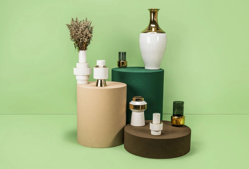This vase with a geometric construction has a totemic outline inspired by the Memphis movement. The white glazed porcelain is embellished by golden details which grant it a sophisticated dimension. This vase is made by hand.