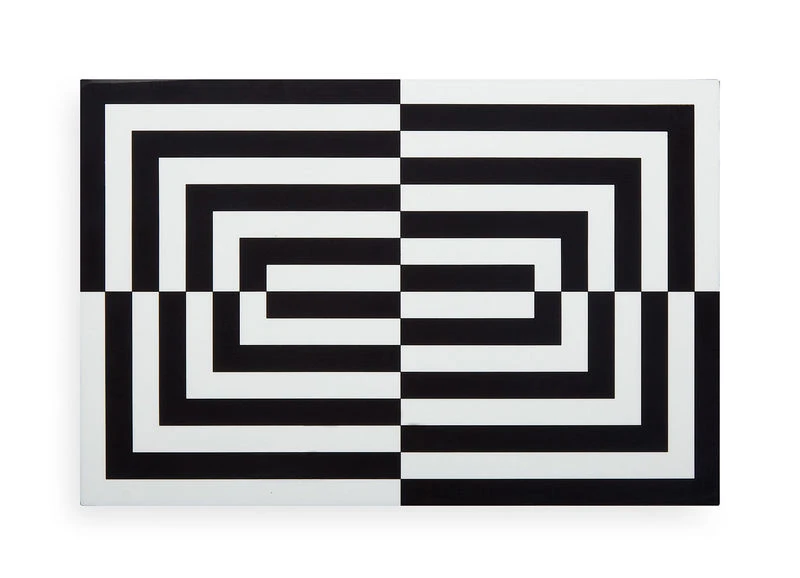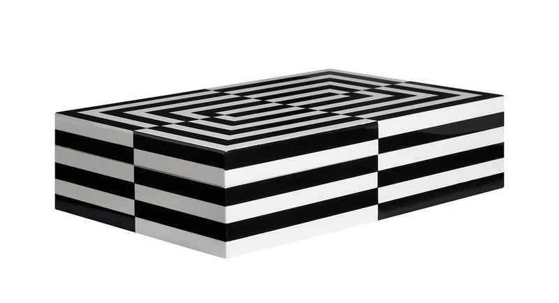 A modernist feel for this collection of precious, refined lacquered wooden boxes. Eternal and timeless, the black & white duo is available with a wonderful geometric decoration, inspired by optical art. It has an asymmetrical collage of broad strips. The repetitive, dynamic pattern includes intermissions: it plays with the use of breaks, offsets and continuity. The stunning contrasting patterns are enhanced by the shine of traditional hand-applied lacquer. The interior of the box is covered with black velvet.