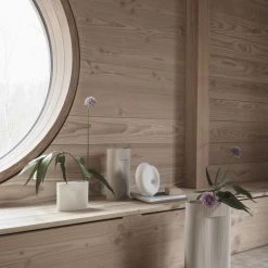 With its narrow shape, the Ridge vase provides a new way of showcasing flowers. The presentation in a line individually highlights each flower. Thus arranged, a bouquet takes on a graceful lightness, almost surreal. Handmade in Portugal, the Ridge vase was designed by the Finish studio, Kaksikko. At the head of this Scandinavian label, we find Salla Luhtasela and Wesley Walters, a creative pair who share a common interest in practical and discreet shapes which highlight the tactile qualities of each material. The Ridge vase’s surface is decorated with embossed ridges. These delicate grooves form a refined serration and give the Ridge vase an organic, plant-like dimension. The Kaksikko studio on the Ridge vase: “The idea of the Ridge vase came when travelling through different towns, looking for details with an architectural footprint. When we got back to our workshop in Finland, we began by drawing by hand and making paper and ceramic models. With its vertical lines and its unique form, inspired by a Parisian door, the Ridge vase has a new way of positioning flowers via a modern expression, with a sculptural character when it is not being used. The Ridge vase has an oval form highlighted by a refined serration. We added the feature of a small handle to be used when moving the vase from one room to another.”