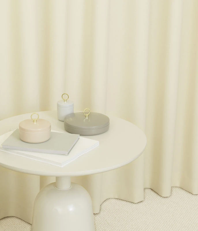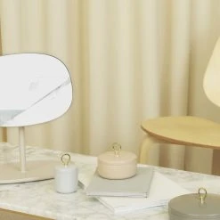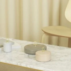 Ring is a collection of small, elegant boxes that can be used to store small items such as jewellery, cosmetic products, or stationary items. The Ring box is made from high-shine lacquered steel and is available in three sizes and various natural tones of sand, grey and taupe. The golden ring on the lid is both functional and decorative.