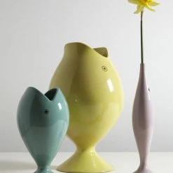 With their mouths open as if eagerly awaiting for water and flowers, the three fish-shaped vases in ceramics are a manifestly iconic and ironic project. The Pesci taliani Collection is inspired by three typical Mediterranean fish, each with a ifferent size and shape : an anchovy (pink), a gilthead (turquoise) and an opah (yellow).
