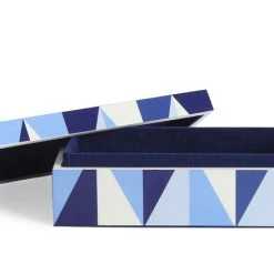 This lacquered wood box is decorated with a wonderful geometric decoration inspired by Op art, available in wonderful shades of blue. The contrasting patterns are enhanced by the brilliance of traditional hand-applied lacquer. The inside of the box is upholstered in blue velvet.