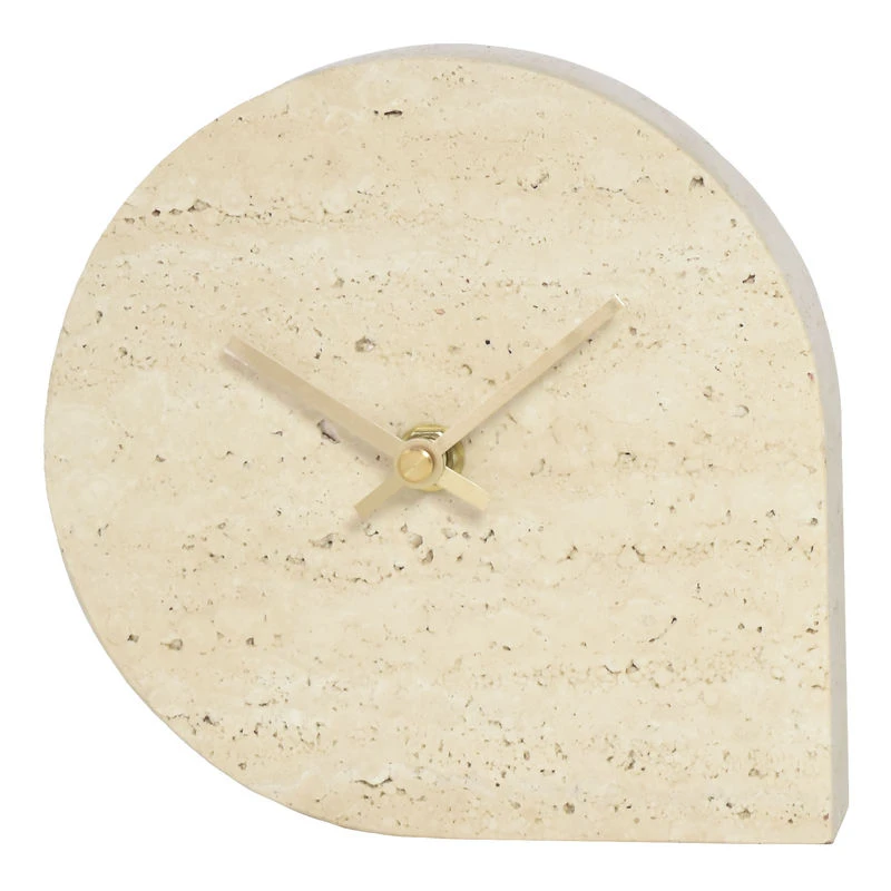 An elegant and modern style is guaranteed with this sleek clock, made in stunning materials. The travertine stone is decorated with two needles in gold metal. Its petal shape is soft and organic. Set on a sideboard, a shelf or bedside table, this highly decorative clock will give you the time wherever you need it, with total class!