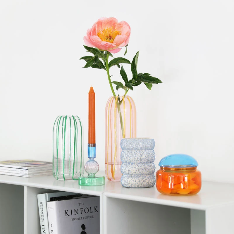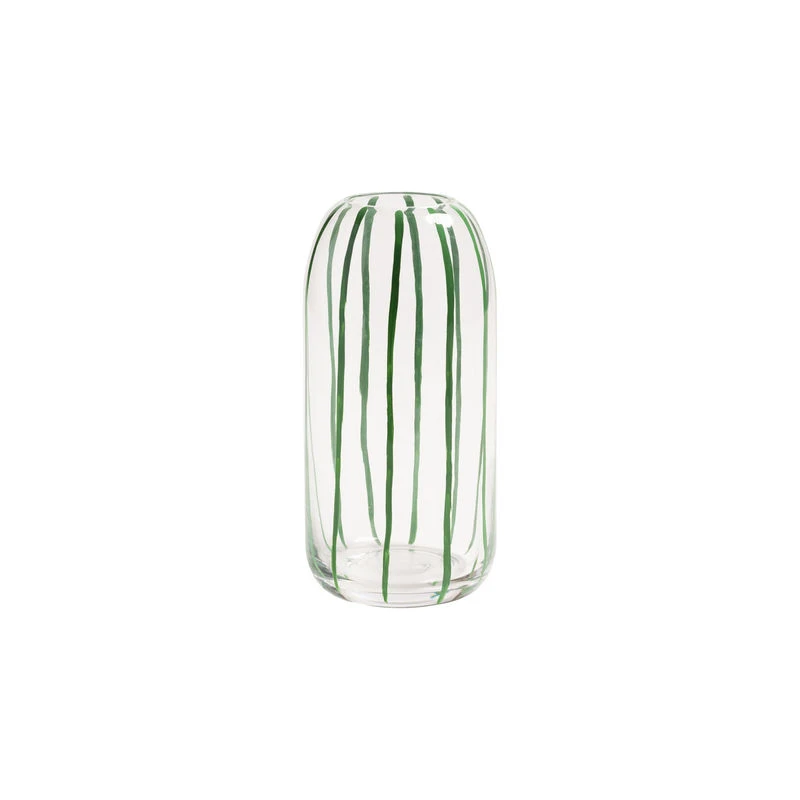 This glass vase plays with colour and transparency. It’s decorated with hand-painted stripes.