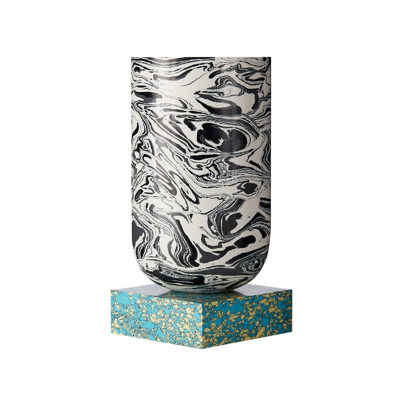 A psychedelic interpretation of the Italian post-modernist aesthetic, the Swirl collection has a certain pop feel about it. Adorned with bold patterns, the geometric shapes are stacked to create multi-dimensional and functional sculptures. Tom Dixon pursues his artistic research inspired by post-consumer processes, the waste phenomenon and its management, and the recycling practices of used materials. The Swirl collection is made up of a material that imitates marble, made from industrial waste : recycled marble powder from sawmills. This powder is mixed with coloured pigments and resin. The material is then cut and turned by hand. The marble pattern provides superb mineral decoration. Because of the pigmentation process, each piece has a unique pattern. The Swirl vases are inspired by Ikebana, the Japanese art of flower arranging. Anchored to a heavy base, the cylindrical vases wonderfully showcase flowers and foliage.