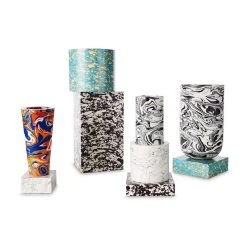 A psychedelic interpretation of the Italian post-modernist aesthetic, the Swirl collection has a certain pop feel about it. Adorned with bold patterns, the geometric shapes are stacked to create multi-dimensional and functional sculptures. Tom Dixon pursues his artistic research inspired by post-consumer processes, the waste phenomenon and its management, and the recycling practices of used materials. The Swirl collection is made up of a material that imitates marble, made from industrial waste : recycled marble powder from sawmills. This powder is mixed with coloured pigments and resin. The material is then cut and turned by hand. The marble pattern provides superb mineral decoration. Because of the pigmentation process, each piece has a unique pattern. The Swirl vases are inspired by Ikebana, the Japanese art of flower arranging. Anchored to a heavy base, the cylindrical vases wonderfully showcase flowers and foliage.