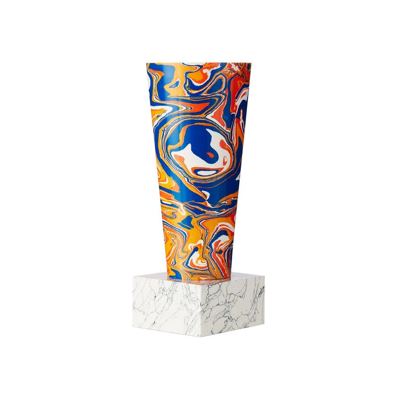 A psychedelic interpretation of the Italian post-modernist aesthetic, the Swirl collection has a certain pop feel about it. Adorned with bold patterns, the geometric shapes are stacked to create multi-dimensional and functional sculptures. Tom Dixon pursues his artistic research inspired by post-consumer processes, the waste phenomenon and its management, and the recycling practices of used materials. The Swirl collection is made up of a material that imitates marble, made from industrial waste : recycled marble powder from sawmills. This powder is mixed with coloured pigments and resin. The material is then cut and turned by hand. The marble pattern provides superb mineral decoration. Because of the pigmentation process, each piece has a unique pattern. The Swirl vases are inspired by Ikebana, the Japanese art of flower arranging. Anchored to a heavy base, the cylindrical vases wonderfully showcase flowers and foliage.