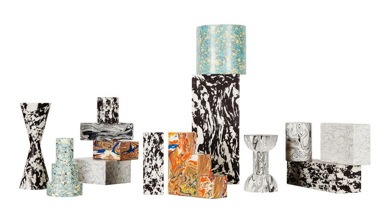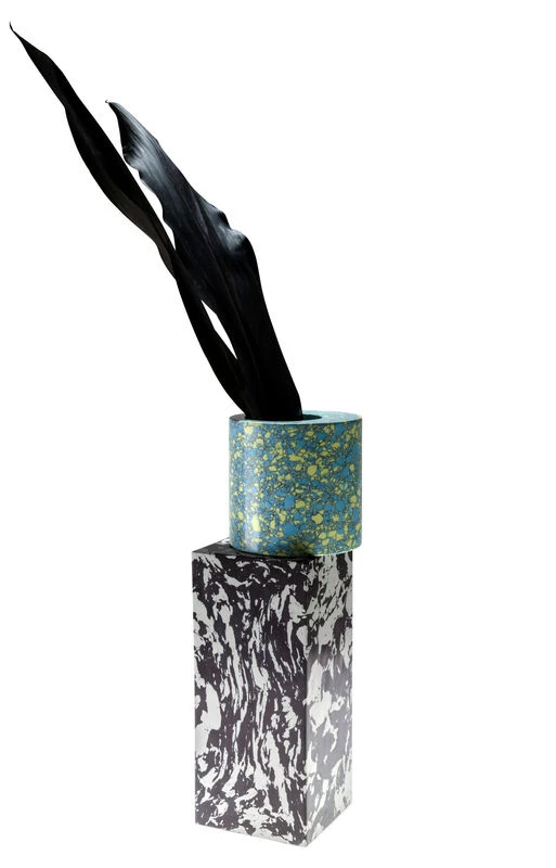 Both refined and modern, the Swirl collection features a sculptural, sophisticated construction that explores the notion of balance. Very graphic, this vase consists of an asymmetrical stack of geometric shapes that perform a true balancing act. The solid, destructured silhouette gives a sense of precarious balance that is just an illusion. Tom Dixon pursues his artistic research inspired by post-consumer processes, the waste phenomenon and its management, and the recycling practices of used materials. The Swirl collection is made up of a material that imitates marble, made from industrial waste: recycled marble powder from sawmills. This powder is mixed with coloured pigments and resin. The material is then cut and turned by hand. The marble pattern provides superb mineral decoration. Through the pigmentation process, each piece has a unique pattern.