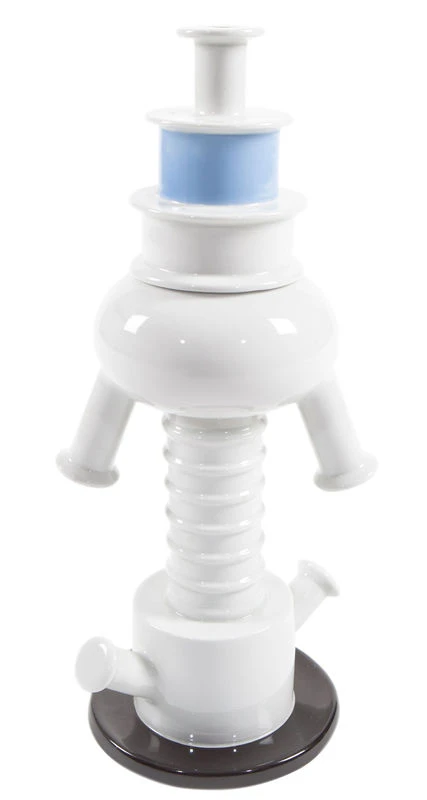 Memphis is the great cultural phenomenon of the ’80s that has revolutionised the creative and commercial logic of the design world. Created on the initiative of Ettore Sottsass and a group of young Milanese architects and designers, shortly to be joined by some of the most famous names on the internatinal design scene, Memphis overturned all the existing preconceptions around the idea of “iving”. With Ettore Sottsass as the backbone of the group, Memphis abolished the creative limits previously dictated by the industry, and Design assumed a new expressivity in the form of new shapes, materials and patterns. Thus, the Memphis movement has become an almost mythical symbol of “New Design” and its influence is still strong in many areas of production and beyond.”Tigris” Porcelain vase, comprised of stacked, spouted and coiled forms covered in powder blue, white and black glazes, Memphis Milano Collection. Signed.