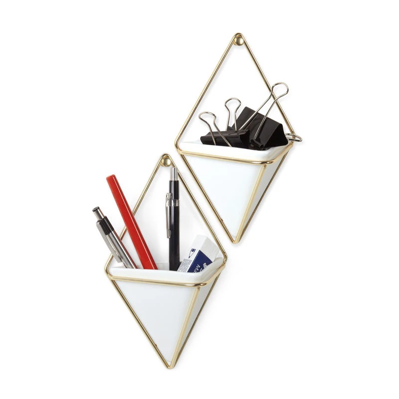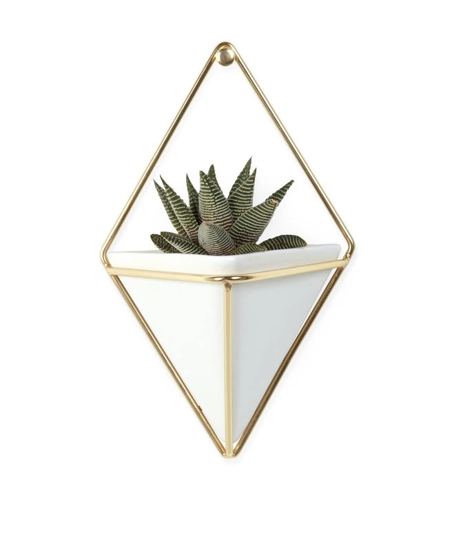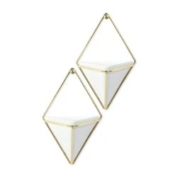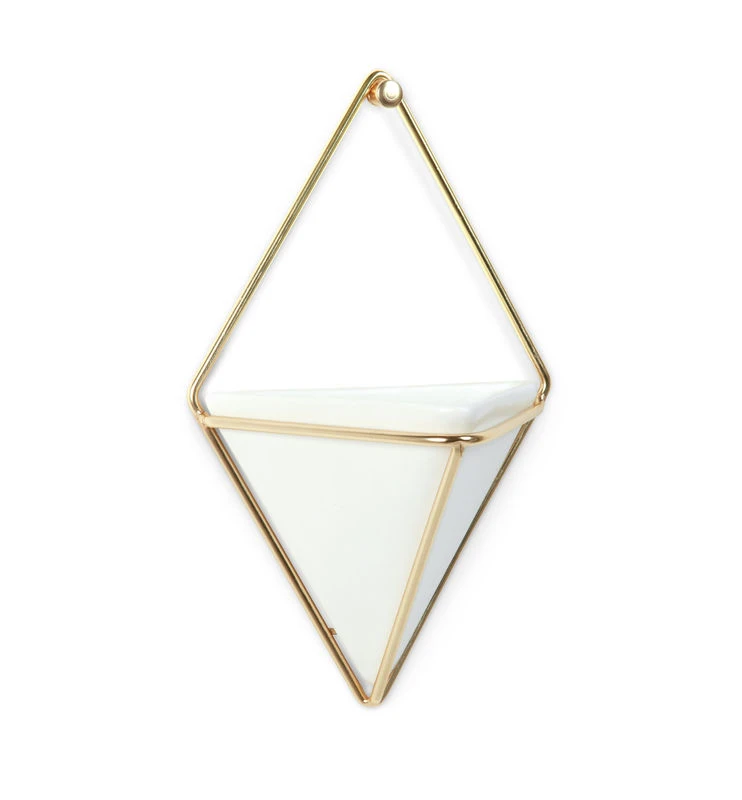 A chic, graphic feel for these prismatic pots to fix to the wall. The faceted geometric shape is ultra-contemporary. These small wall storage units consist of white porcelain pots inserted into a gilded metal cage structure. These pots attach to the wall with matching gold metal hooks (hooks included). You can use them as flower pots to show off your small plants (cacti, succulents or aromatic plants). You can also use them to store small items: jewellery, pencils, desk accessories, make-up, coins … This set includes 2 wall pots.