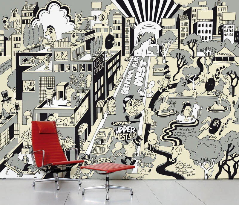 A French invention, panoramic wallpaper has gone through several waves of crazes, most often related to the health of the wallpaper industry. Its very first appearance goes back to the end of the 18th century, its expansion to the Restoration and its last breaths in the 1970/1980s. Considered to be old-hat at the end ofthe 1980s by an exaggeration of its initial interest, to open a artificial window to a realistic or fantasyexterior, the style disappeared with the photographic models caricaturing the natures of the «Four Seasons» (snow-capped summits, flamboyant sunsets, etc.) The new Domestic landscapes propose rehabilitating and reintroducing monumental decors with panoramic wallpaper by making a clean sweep of the photographic tracks explored in the past and by proposing about 10 artists, designers or graphic artists to create contemporary decors which today can justify rehabilitating this type of decor. Imagined and designed by +41, Coco Tassel, Dylan Martorell, Elisabeth Arkhipoff, Geneviève Gauckler, Ich & Kar, Jeremyville, Jon Burgerman, Klaus Haapaniemi, Kustaa Saksi, Mark Verhaagen, matali crasset, Pandarosa, Pierre Marie, Rolito, Ryan Cox, Studio Job, Tado, Timorous beasties the decors in this initial collection economise on large openings to landscapes that are sometimes dreamlike,or introspective, urban or pastoral, nostalgic or prospective and, most of the time, on a nature or a world dreamed of and inhabited by fantasy creatures. Printed on high-quality intissé paper, each decor is 4 metres wide by 3 metres high and comes in the form of eight strips to be assembled. All the decors can be cut downwards and across to adapt to all sizes of walls. Limited edition to 100 numbered pieces per year and signed by the artist.